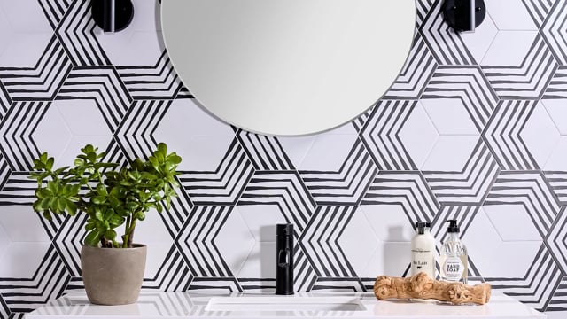 Fusing the charm of encaustic tiles with the durability of porcelain, Sio Strata Navy offers a harmonious geometric pattern in a soothing deep ocean blue.